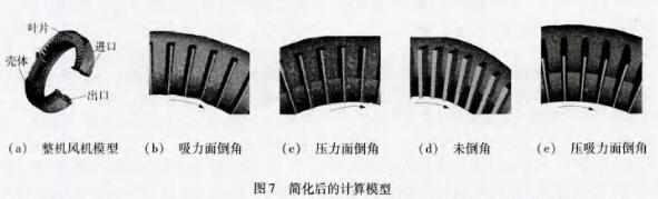 為了更全面的了解高壓鼓風(fēng)機葉片側(cè)邊型線對風(fēng)機性能的影響,考慮到葉片在完全設(shè)有倒角情況下和壓吸兩面都倒角情況下的風(fēng)機性能。